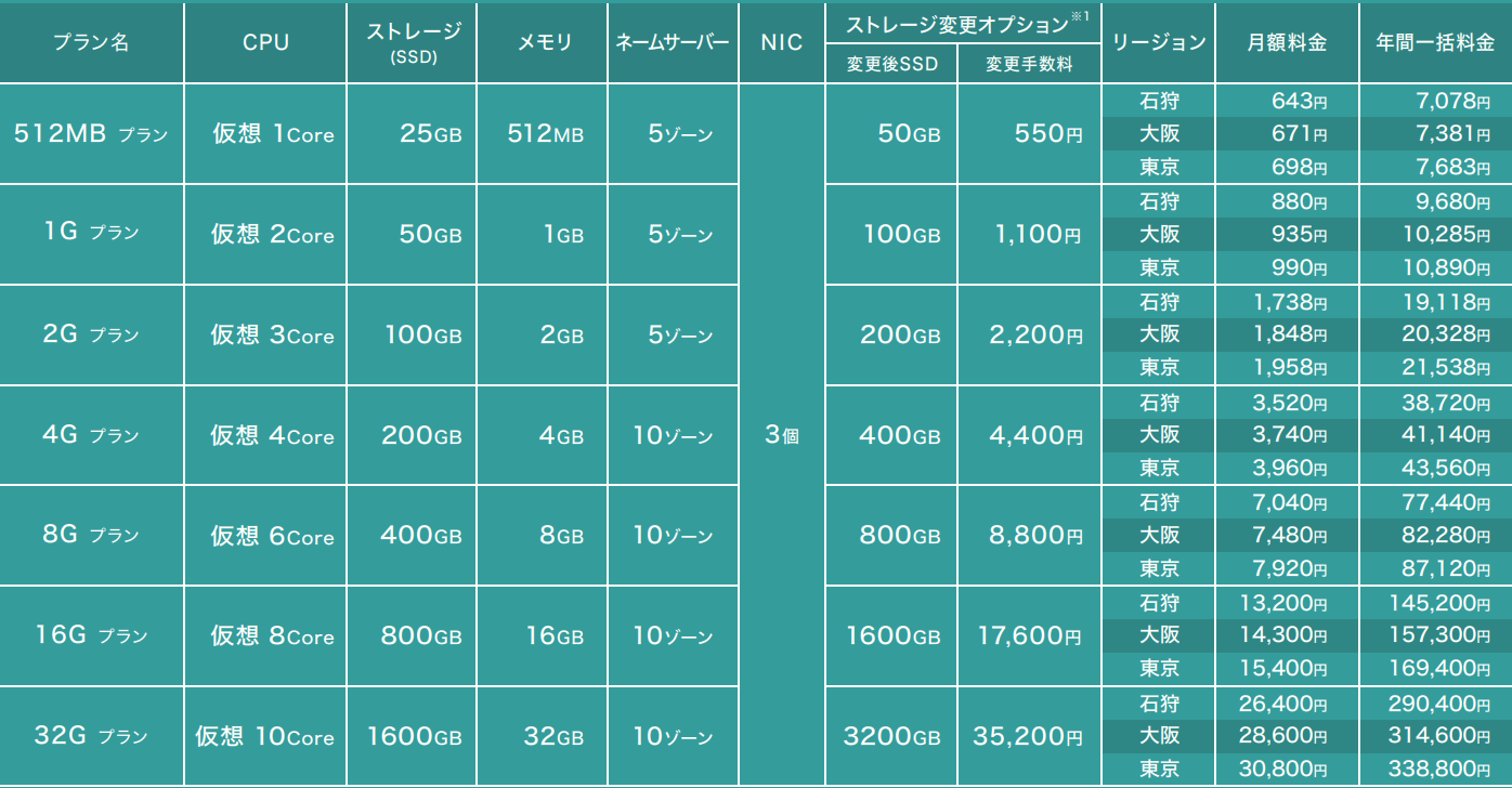 CPU1コア、SSD1GBあたりとしてはメモリ1GBプラン、メモリ1GB、HDD1GBあたりとしてはメモリ2GBプランが月額最安になる。